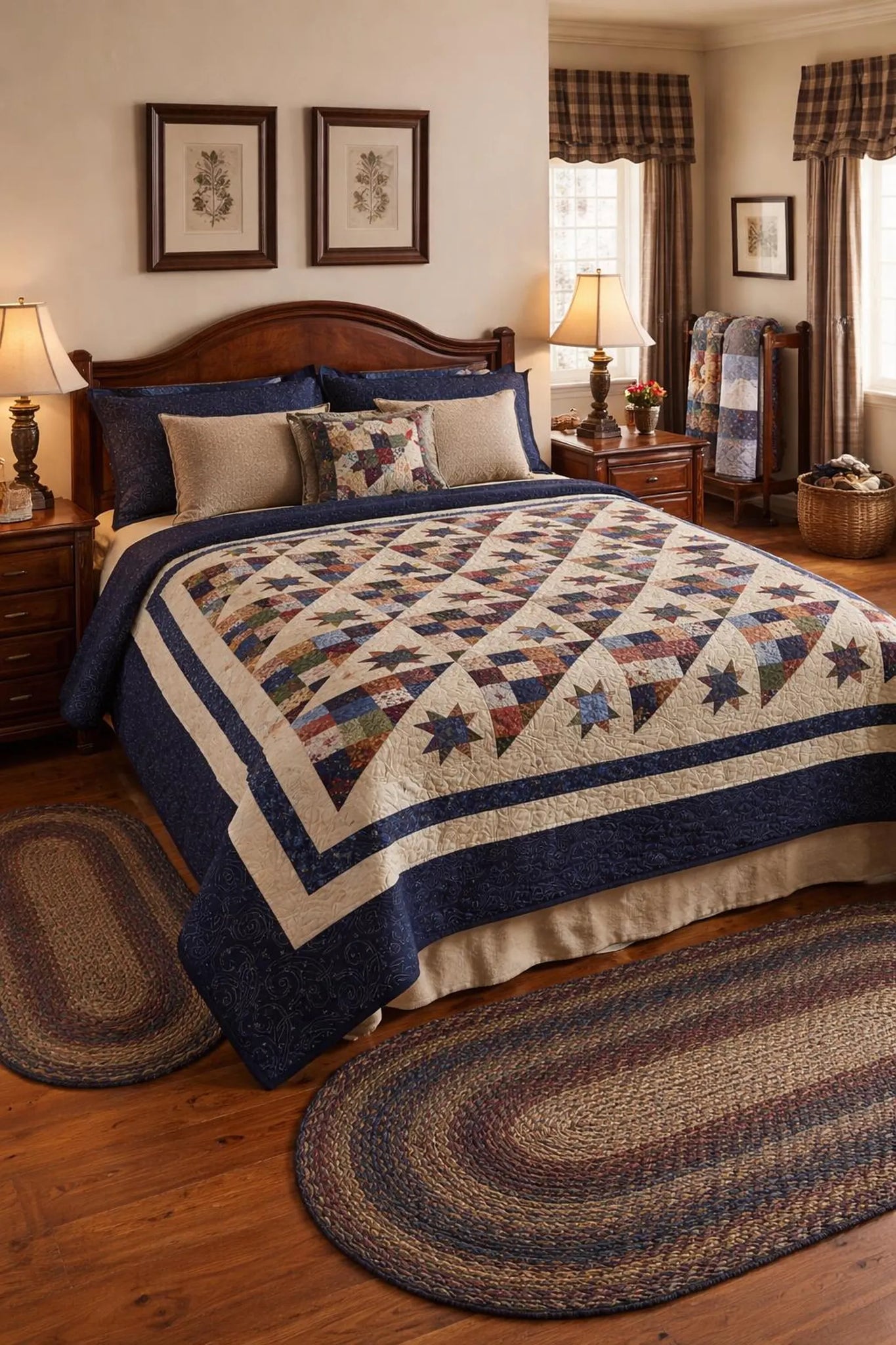 This handmade quilt is a timeless blend of tradition and comfort. Featuring a classic star pattern framed by rich borders, it brings warmth, balance, and quiet elegance to any bedroom.