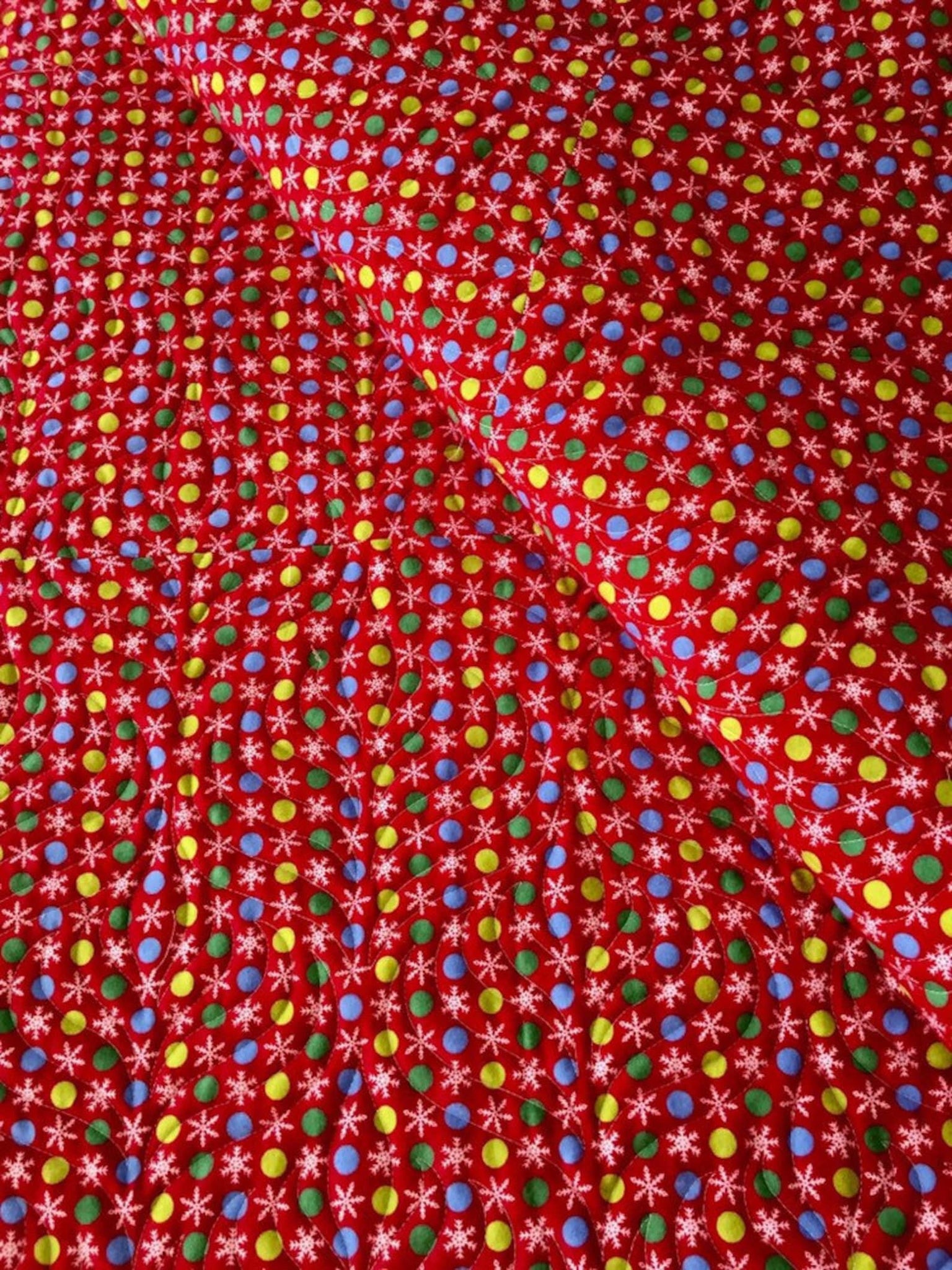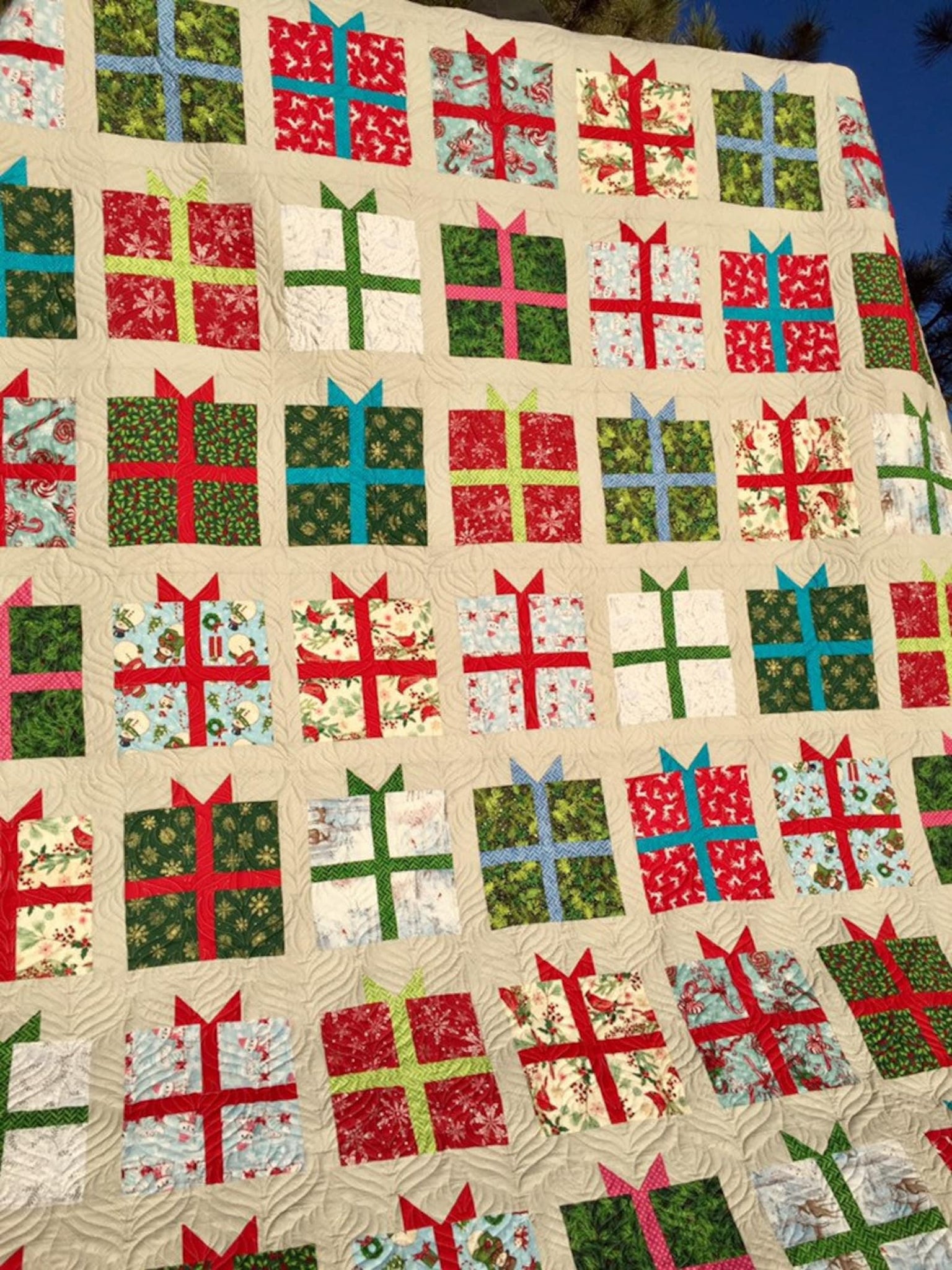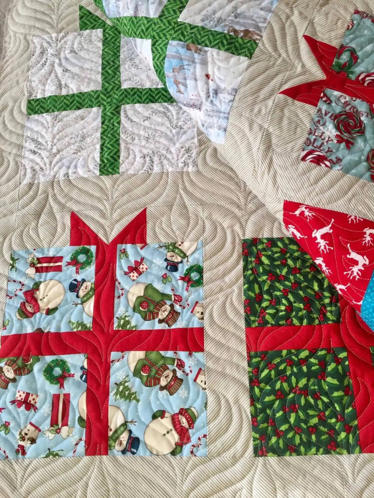 This cheerful handmade quilt is inspired by the joy of the holiday season, featuring charming wrapped gift blocks tied with bows and ribbons. Each “present” is pieced in festive prints and colors, creating a playful yet timeless design that brings warmth and celebration into any space.