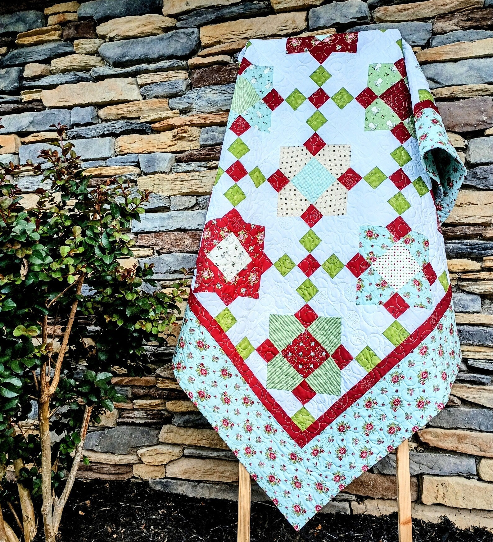 It’s a very beautiful quilt with accurate precise piecing, computerized quilting and modern fabrics. Blue, bright reds and greens look so fresh and cheerful on crispy white background! pictures don't make justice to this adorable quilt.