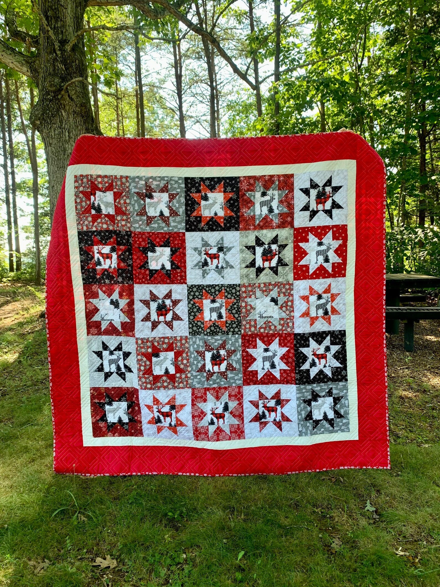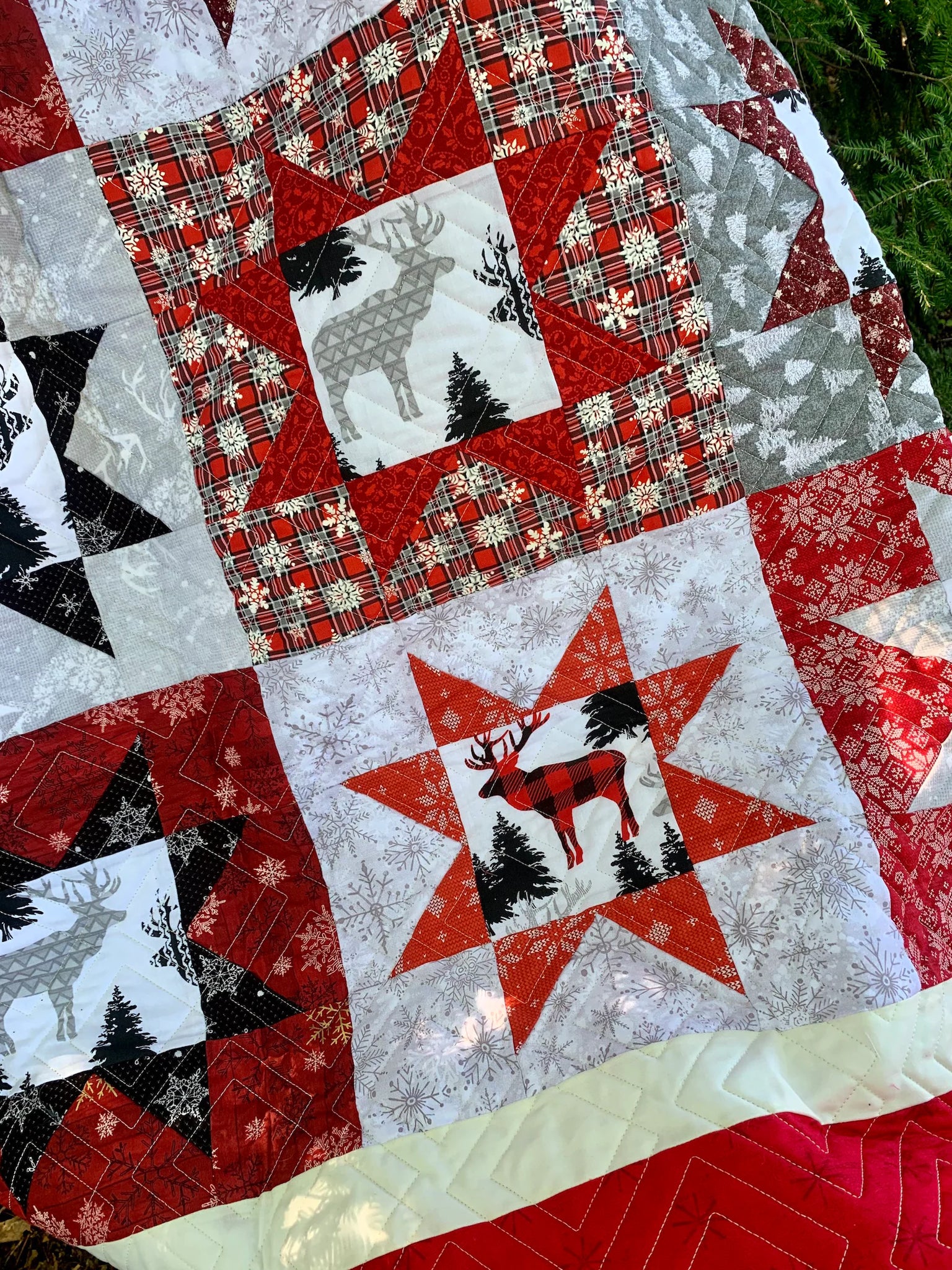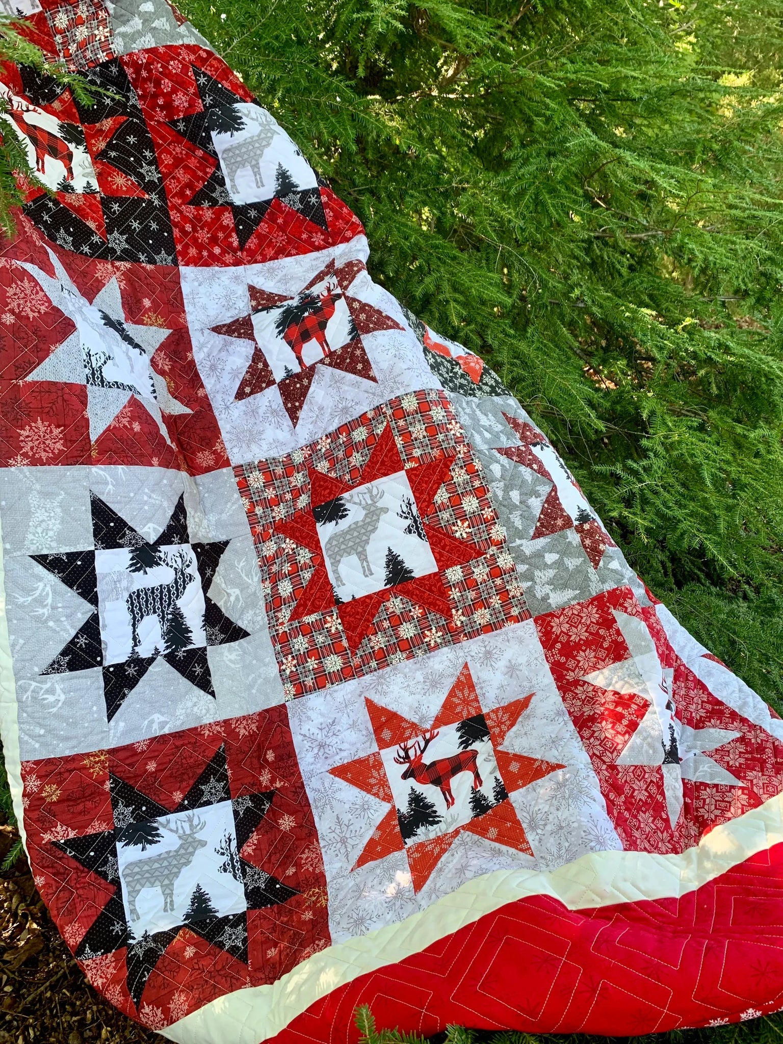 This very pretty and simple quilt is made with modern quilting fabric in a traditional Scandinavian color palette. Joyful colors, fun prints: elk, bear, deer, moose fussy cuts, and lots of various snowflakes. The backing is a bright red flannel, cozy and cuddly.