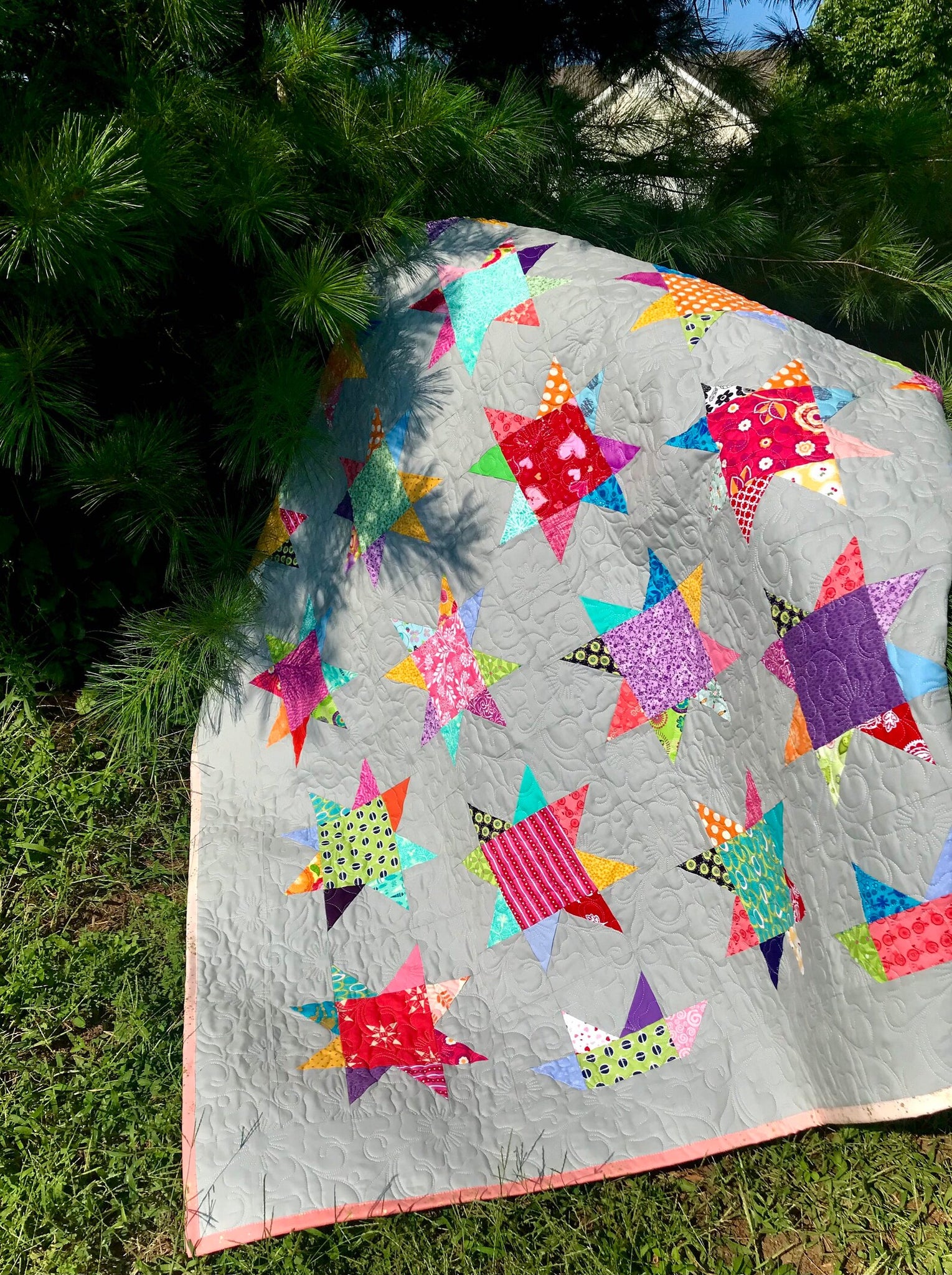 • Load image into Gallery viewer, Modern quilt, bright scrappy stars, Gray background.