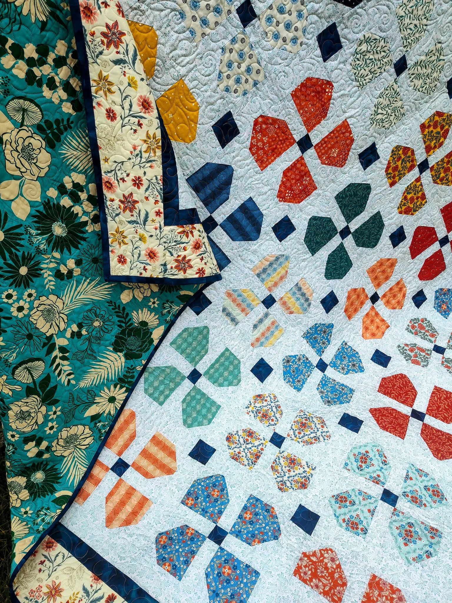This handmade quilt is a celebration of color, movement, and light. Featuring butterfly-inspired blocks arranged in a lively grid, it blends cheerful shades of blue, teal, orange, yellow, and soft florals against a crisp white background. The result is a quilt that feels fresh, uplifting, and full of life.