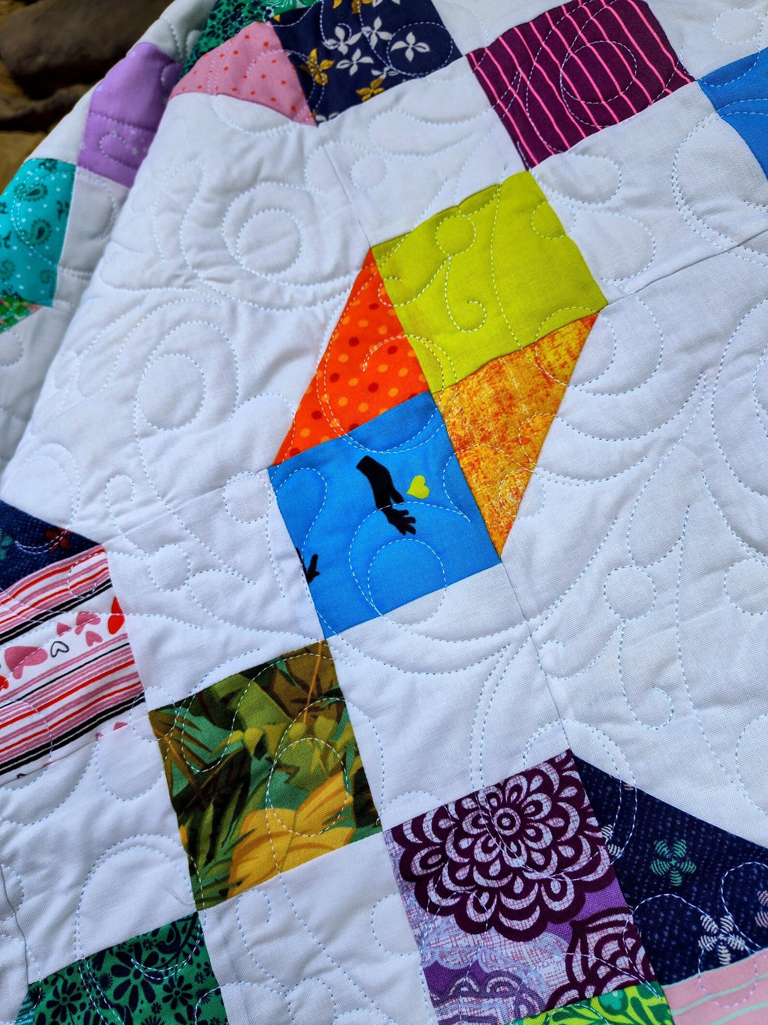 White background and happy bright scrappy stars. Beautiful quilt for a kid’s or teen’s room, modern fresh look.