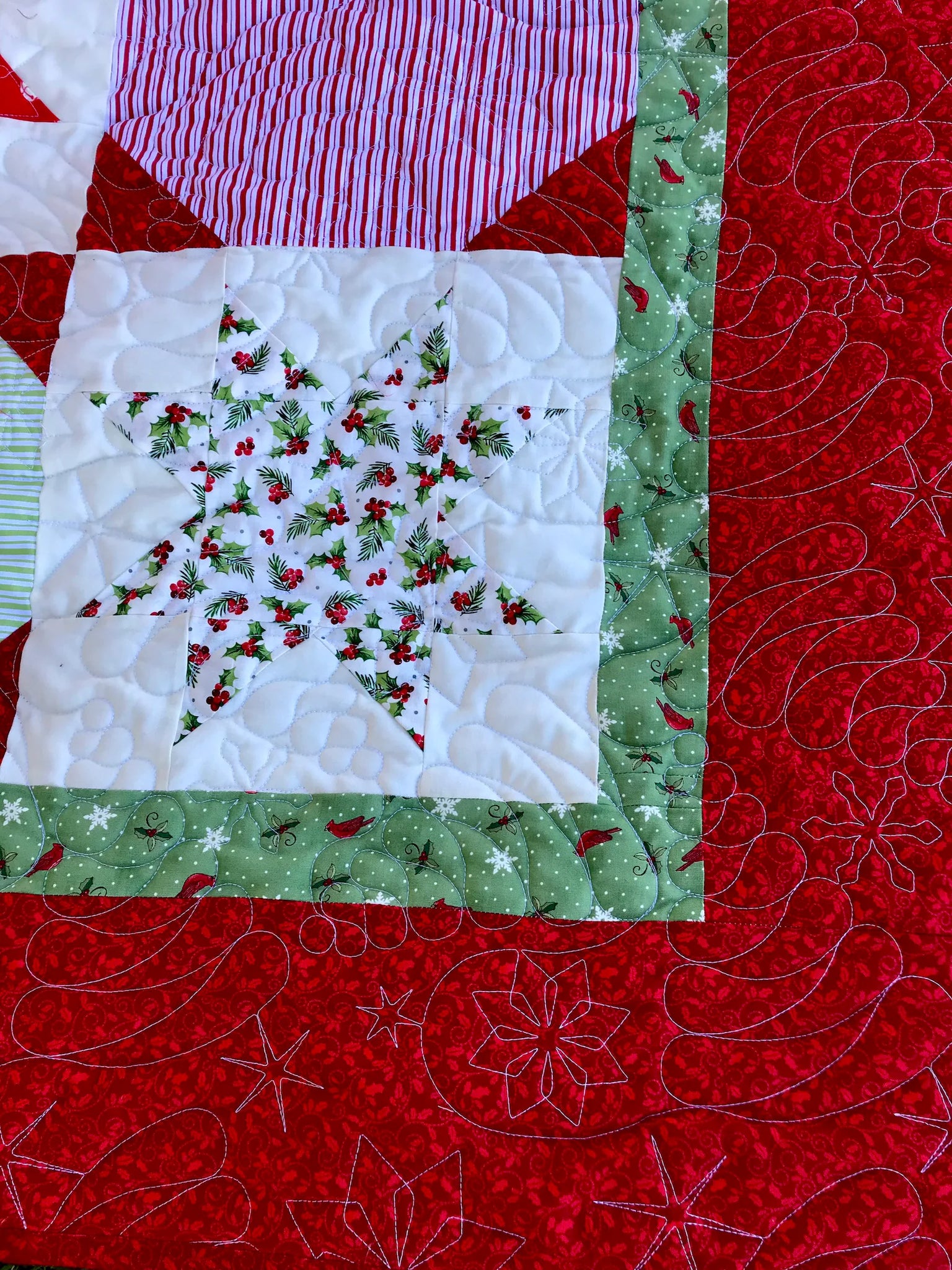 Absolutely beautiful and bright Christmas quilt, jolly reds, and greens married with gentle creams. Fun winter prints, snowflakes and birdies, holly leaves, and deer.