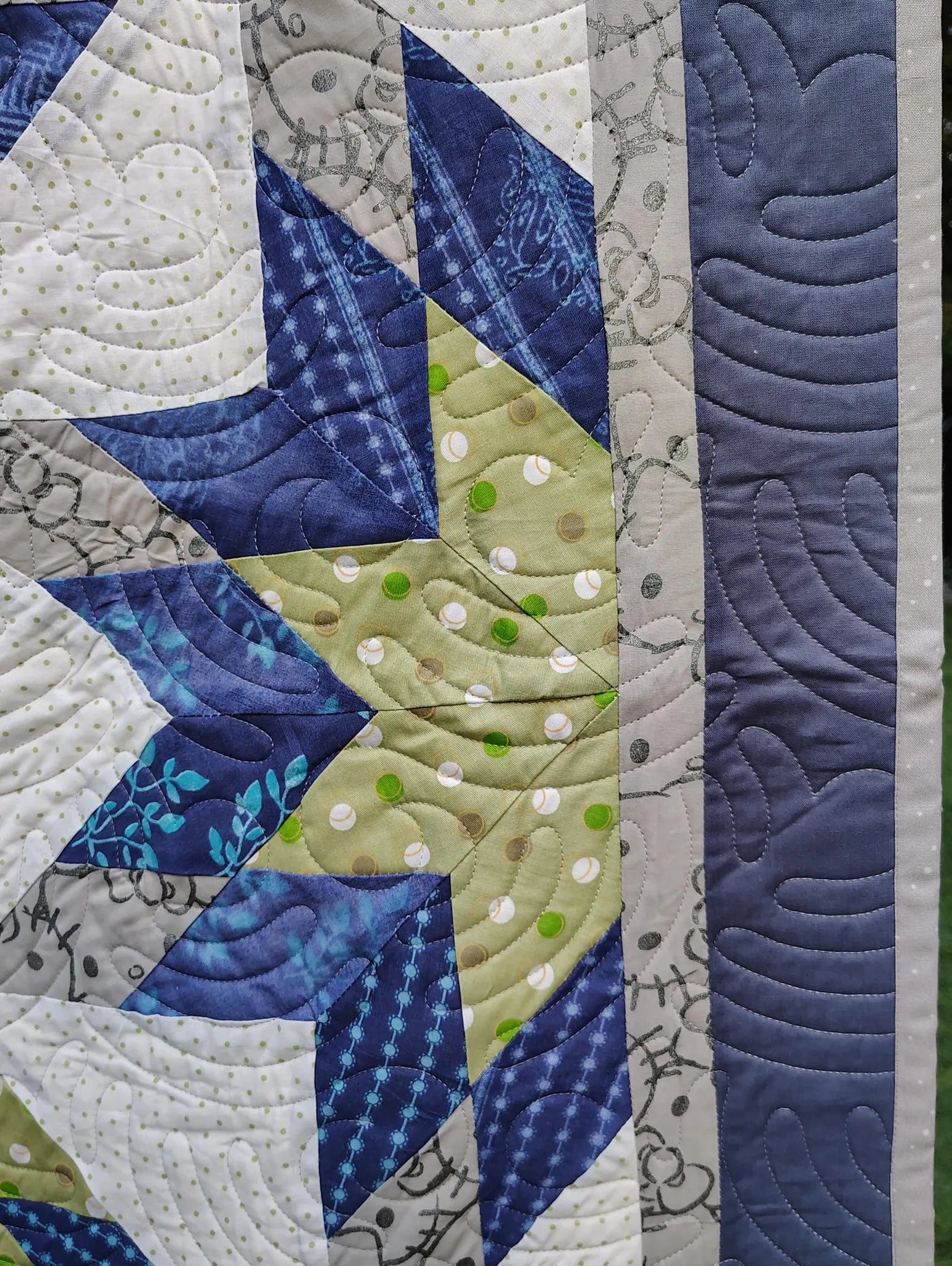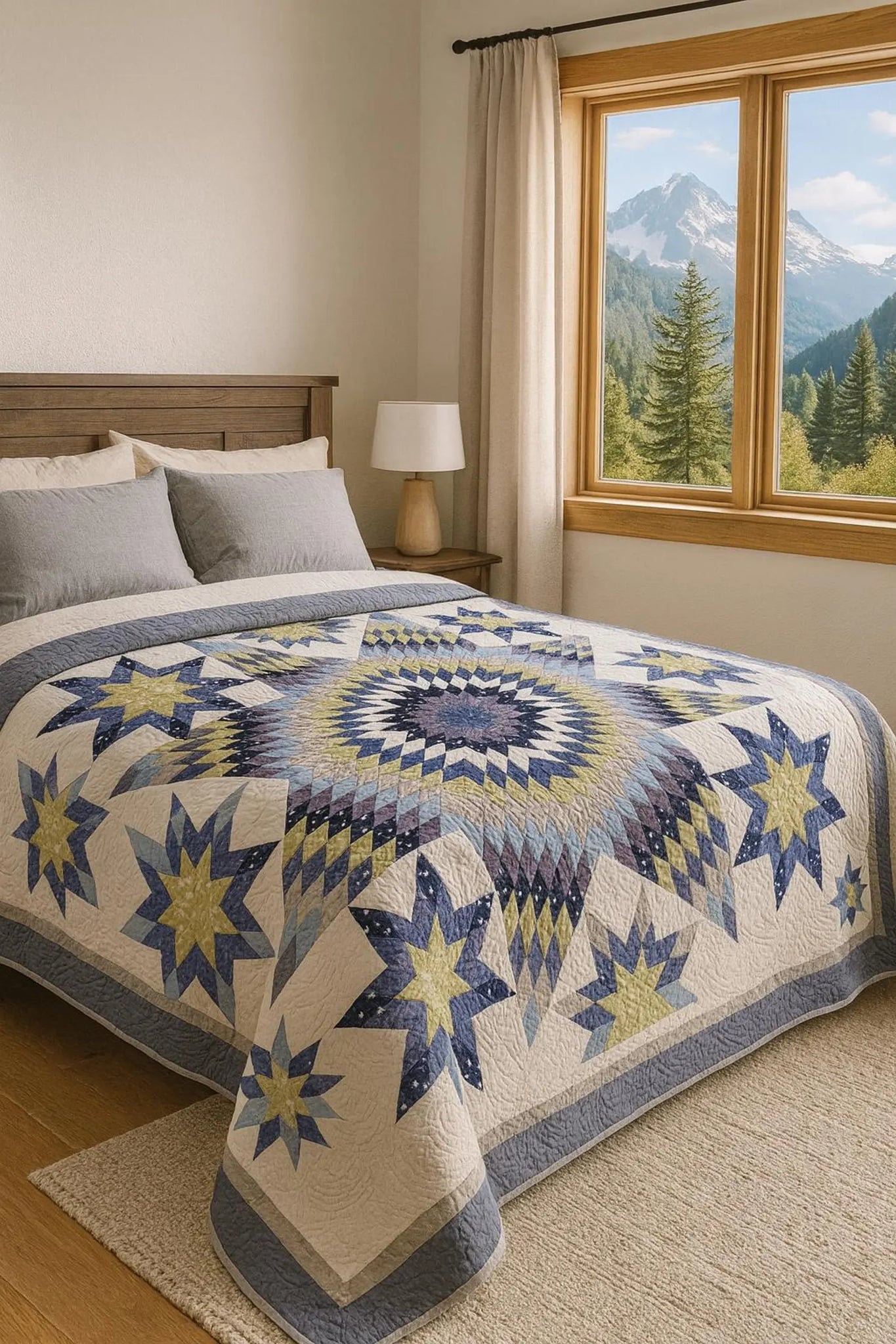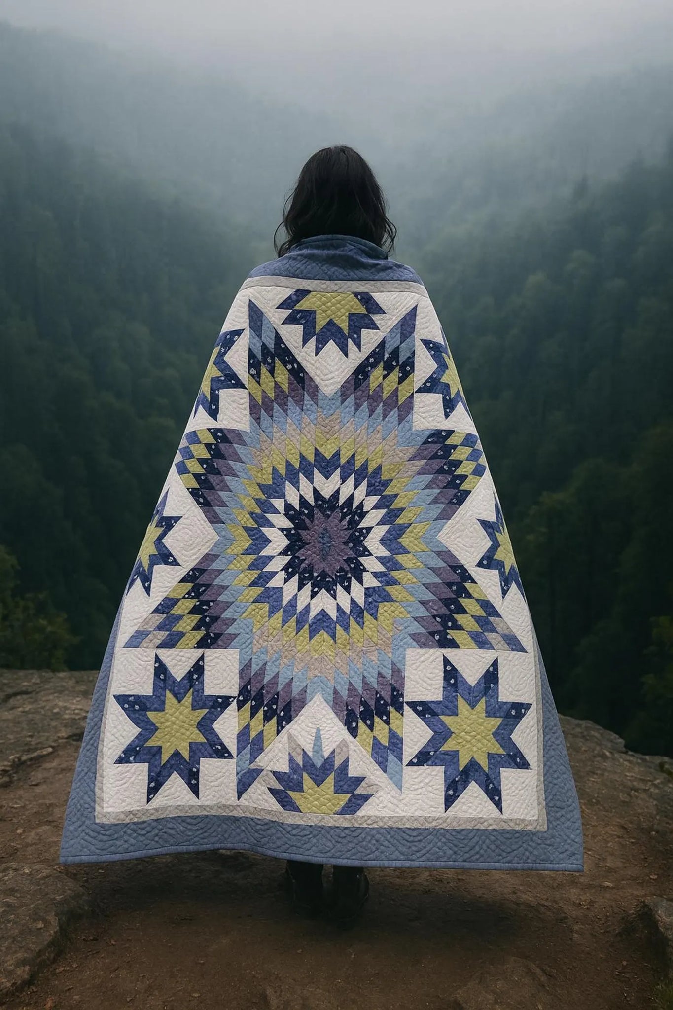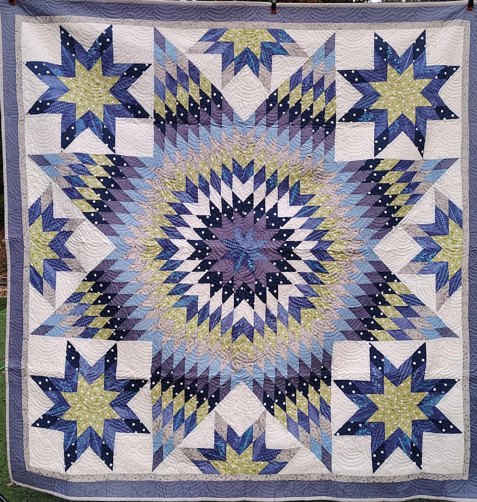 This stunning queen size quilt is crafted in the timeless bursting star pattern, a traditional Native American inspired design that radiates beauty and meaning. The bold starburst is pieced from carefully chosen 100% cotton fabrics in soothing shades of blue, green, and purple, creating a breathtaking centerpiece for any room.