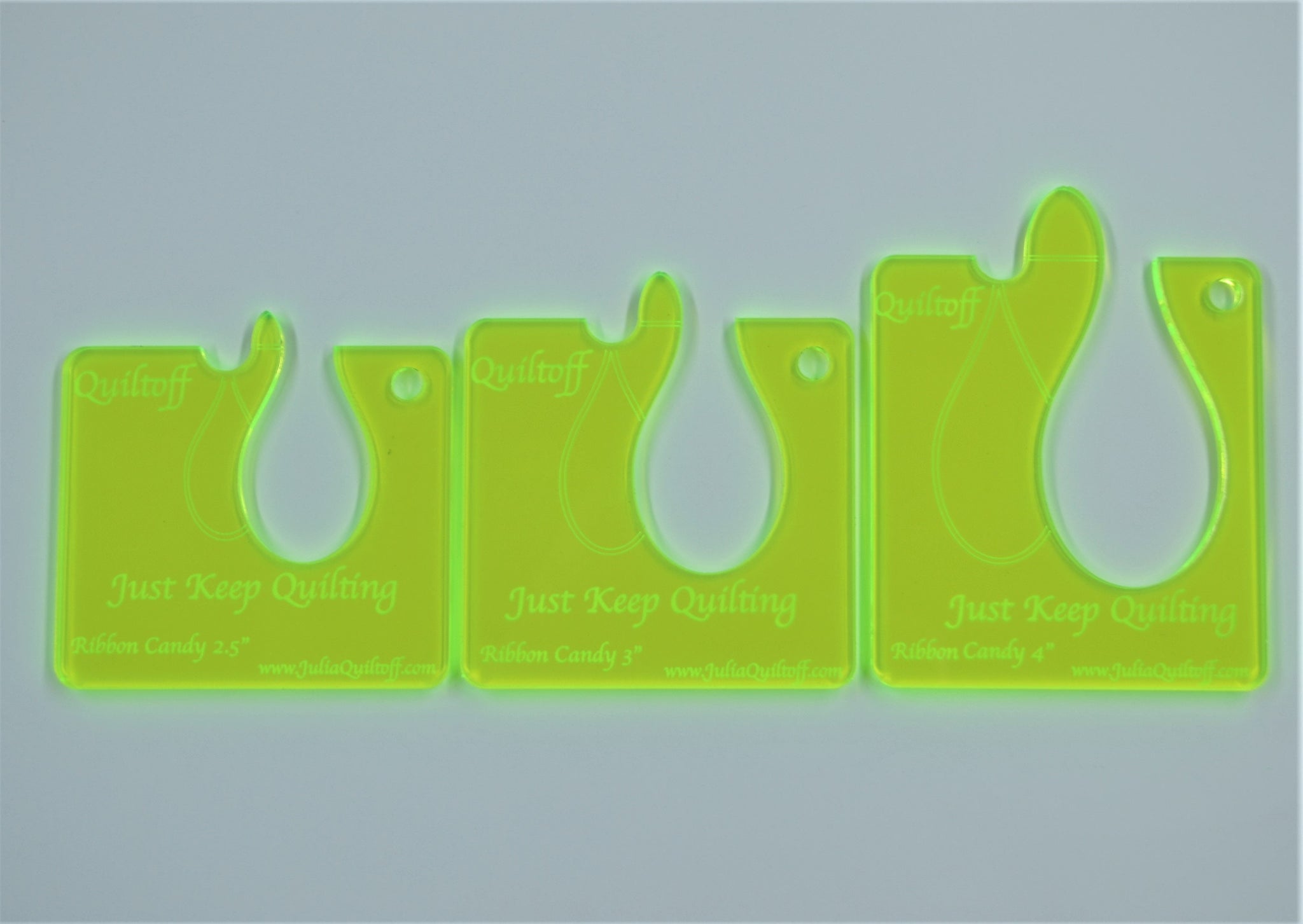Set of 3 templates to create an accurate nicely spaced traditional quilting design. Great ruler for both longarm Quilters and domestic machine Quilters. Works great for basic ruler work. The ruler comes in green neon color. These ones are wonderfully seen on a quilt, so you will forget about losing your clear ruler. Extra-large space for safe grip and stability. Three sizes of ribbon: 2.5 in, 3 in, 4 in. (height of design). Reversible. Watch the tutorial here: https://youtu.be/BnhBt6Ohzqw.