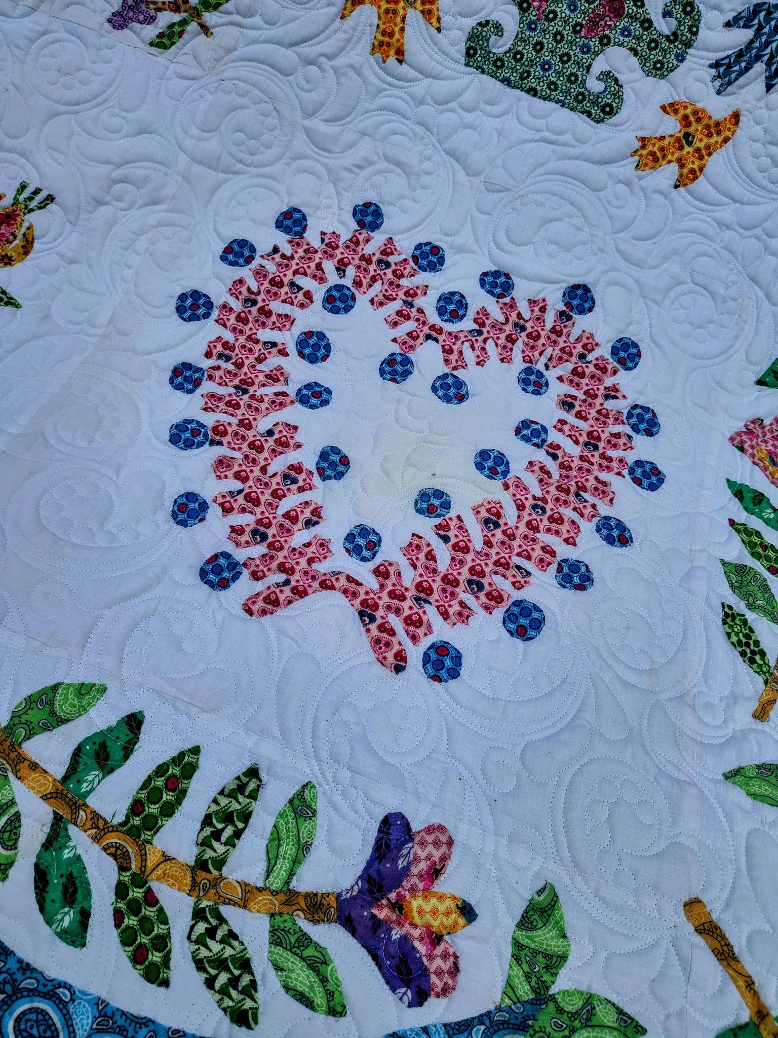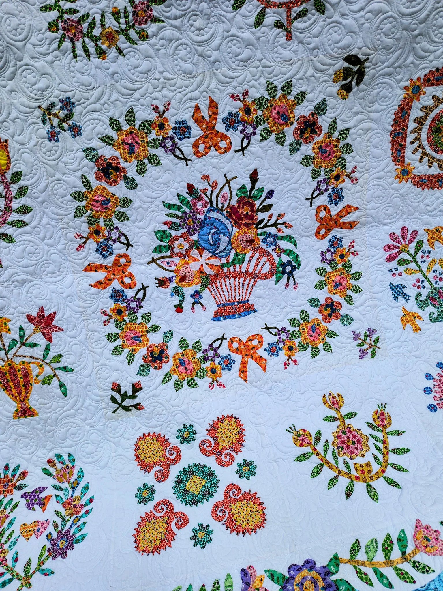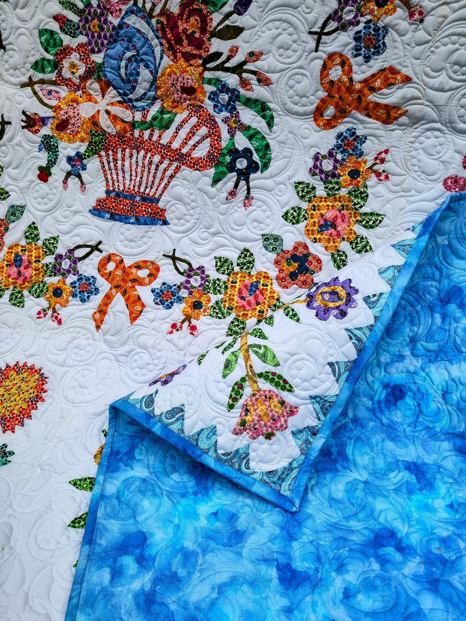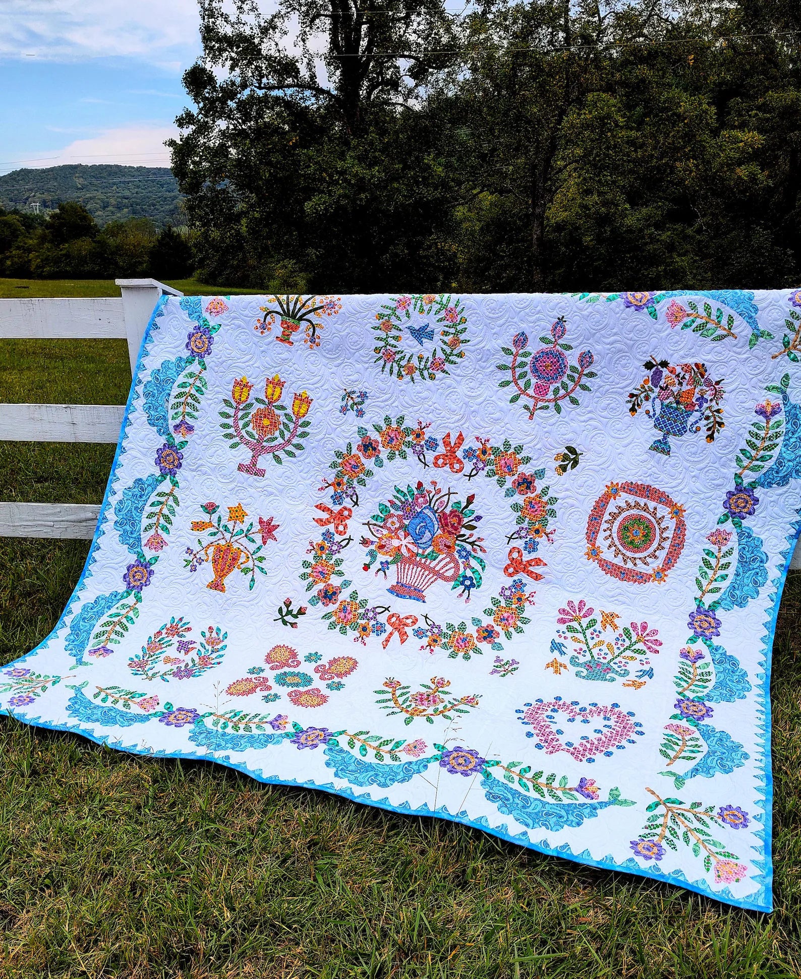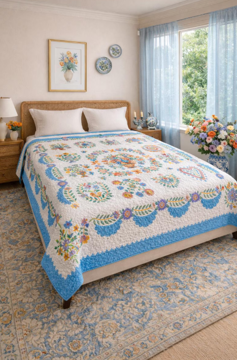 Elevate your bedroom décor with this exquisite queen size quilt, showcasing a delicate needle turn hand applique in the timeless Baltimore album traditional pattern. Skillfully crafted with modern fabrics paired with a traditional layout, this quilt not only adds a touch of elegance but also embodies quality and craftsmanship. Professionally pieced and quilted, each piece is a testament to dedication and artistry, ensuring durability and beauty. Proudly made in the USA, this quilt is perfect for those who appreciate the blend of modern aesthetics with classic designs.