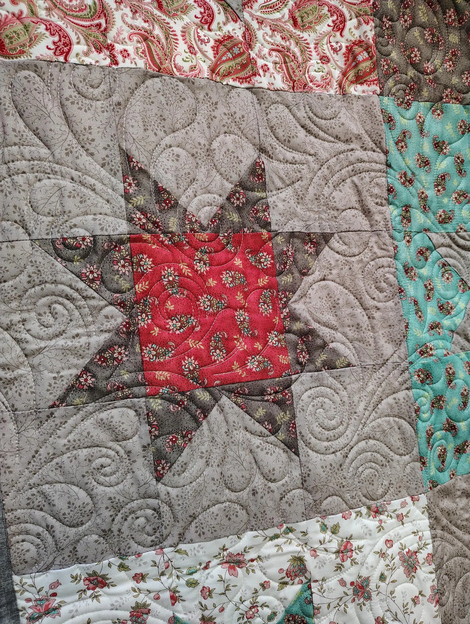 This beautiful handmade throw quilt measures 53” x 53” and is crafted with care using premium quilting cottons from the Clara collection. The charming star blocks are pieced in a soothing palette of soft reds, aqua, creams, and browns, giving the quilt a timeless, cozy look.