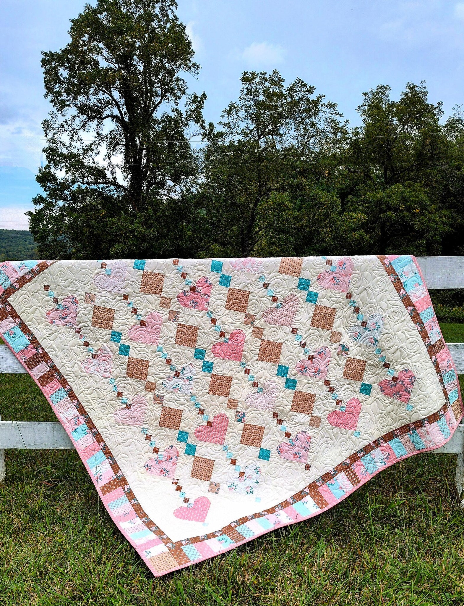 Introducing a charming handmade English Cottage Style Quilt, a delightful throw-sized piece that adds warmth and character to any room. Featuring a delicately blended palette of soft pink, serene blue, and rich brown against a creamy background, this quilt showcases intricate patterns that evoke the nostalgic charm of a quaint countryside cottage. Expertly pieced and machine quilted by a professional quilter, it not only promises durability but also offers a beautiful texture that enhances its visual appeal. Perfect for snuggling up on chilly evenings or as a decorative accent draped over a chair or bed, this quilt is sure to be a cherished addition to your home décor.