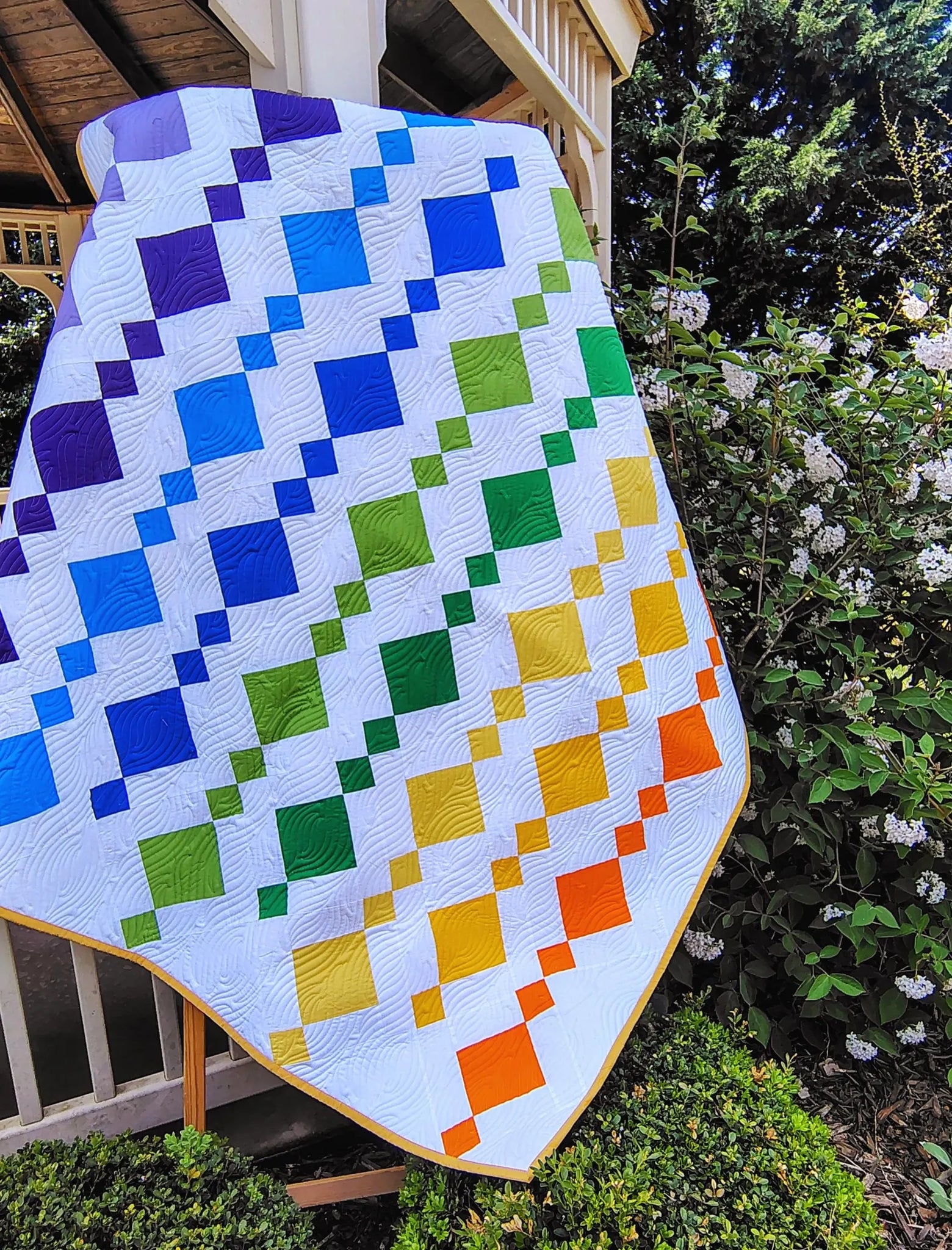 This stunning throw-sized quilt features a vibrant, multi-sized diamond pattern in a spectrum of rainbow colors. The striking "Chandelier" design pops against a crisp white background, allowing the bold hues to truly shine. The modern wave quilting adds texture and depth, while the double wool batting ensures a cozy, luxurious feel. Handmade with love and quilted using a professional long-arm machine in the USA, this quilt offers a fresh, modern vibe and would make a unique, thoughtful gift. Proudly crafted by a small, woman-owned business, it's a one-of-a-kind piece that will brighten any space.