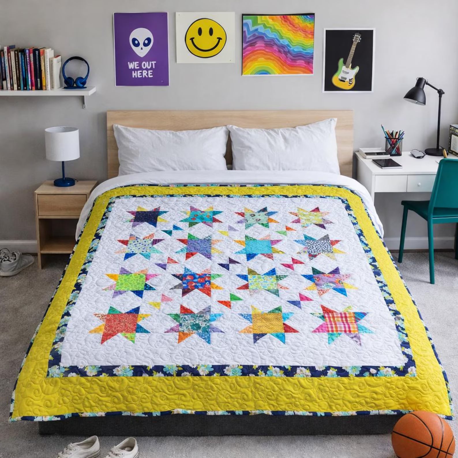 New, never used, 100% high-quality quilting cotton fabrics. Handmade Colorful Star Quilt – Cheerful Modern Patchwork Throw