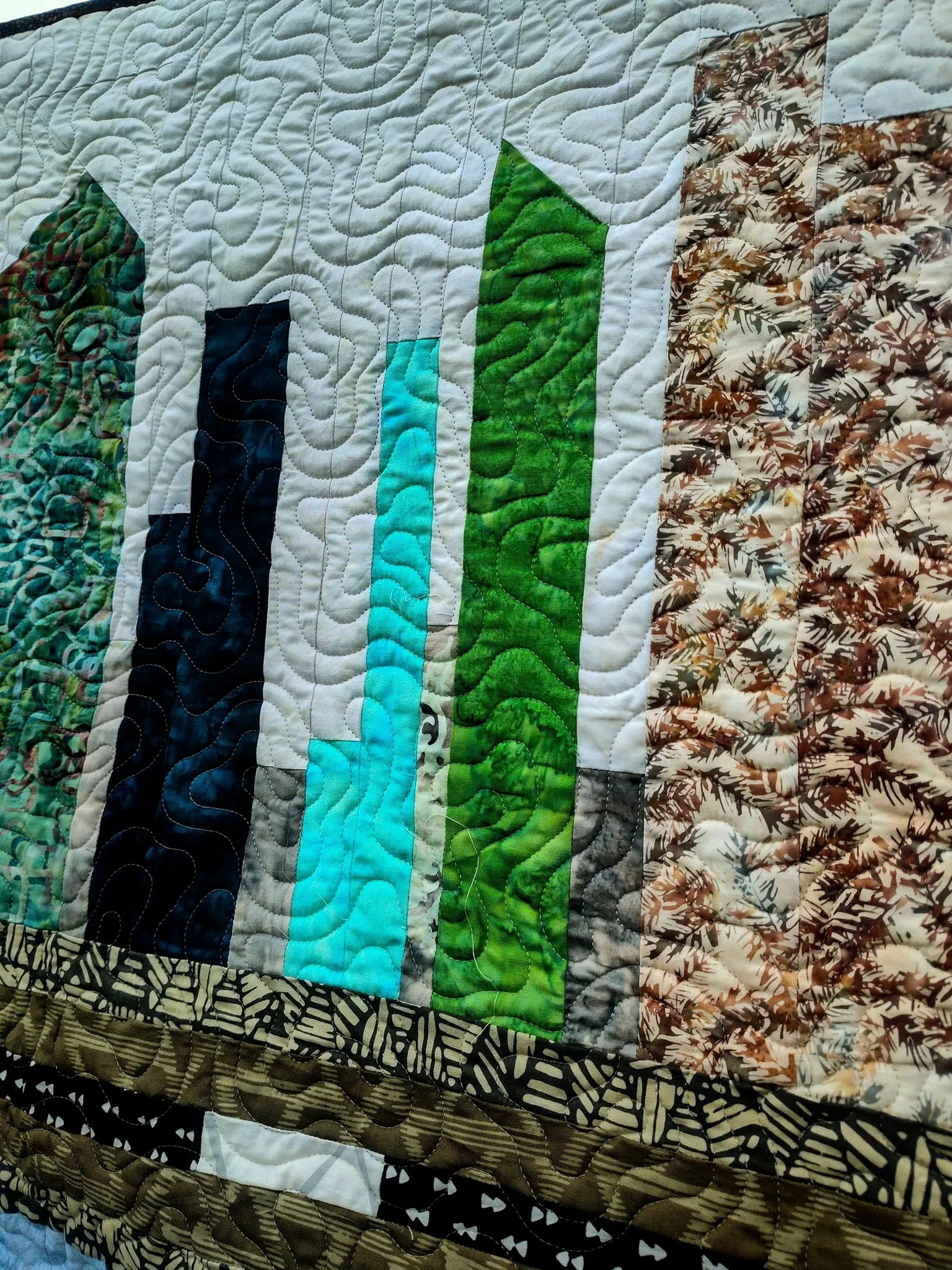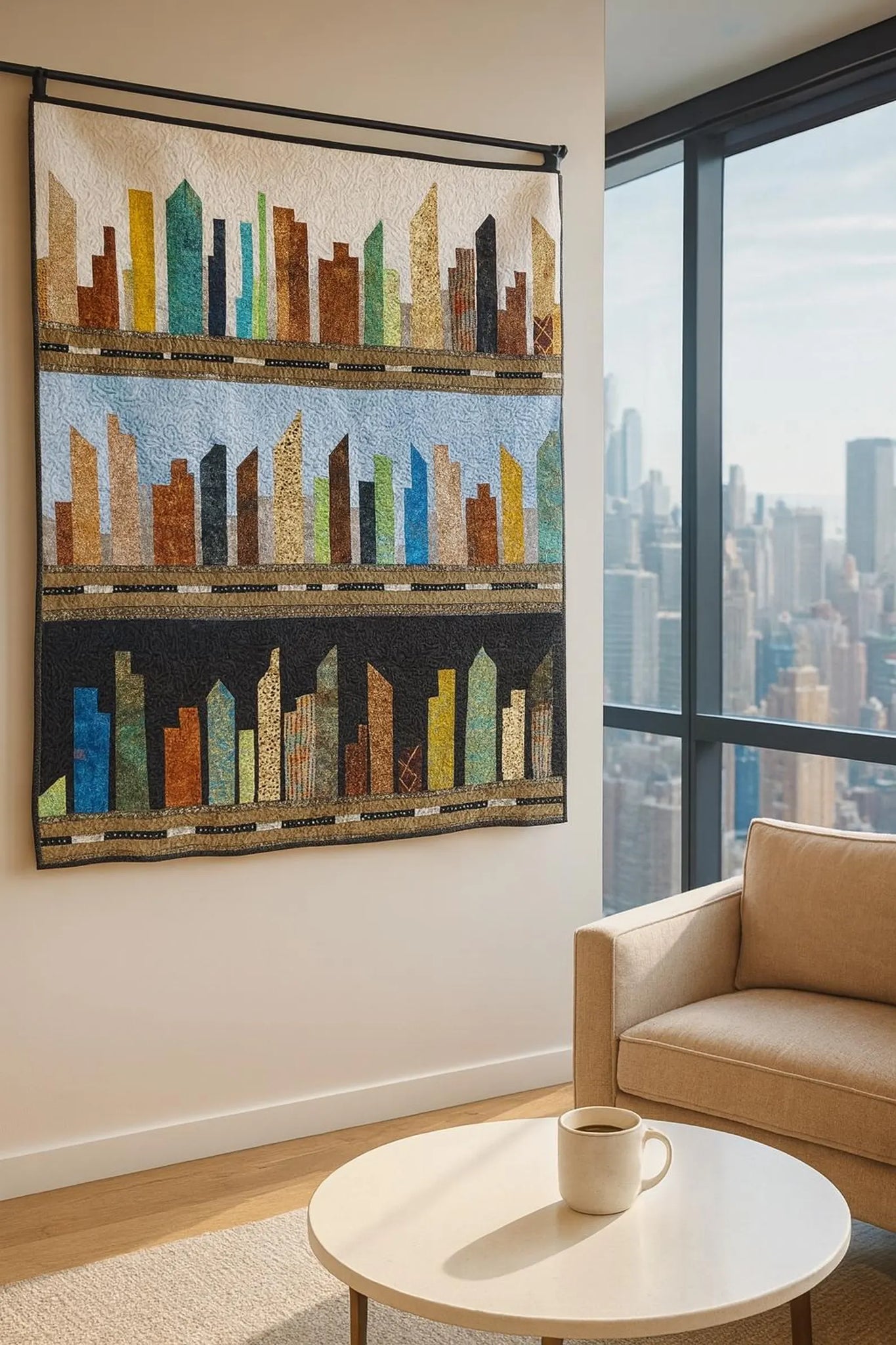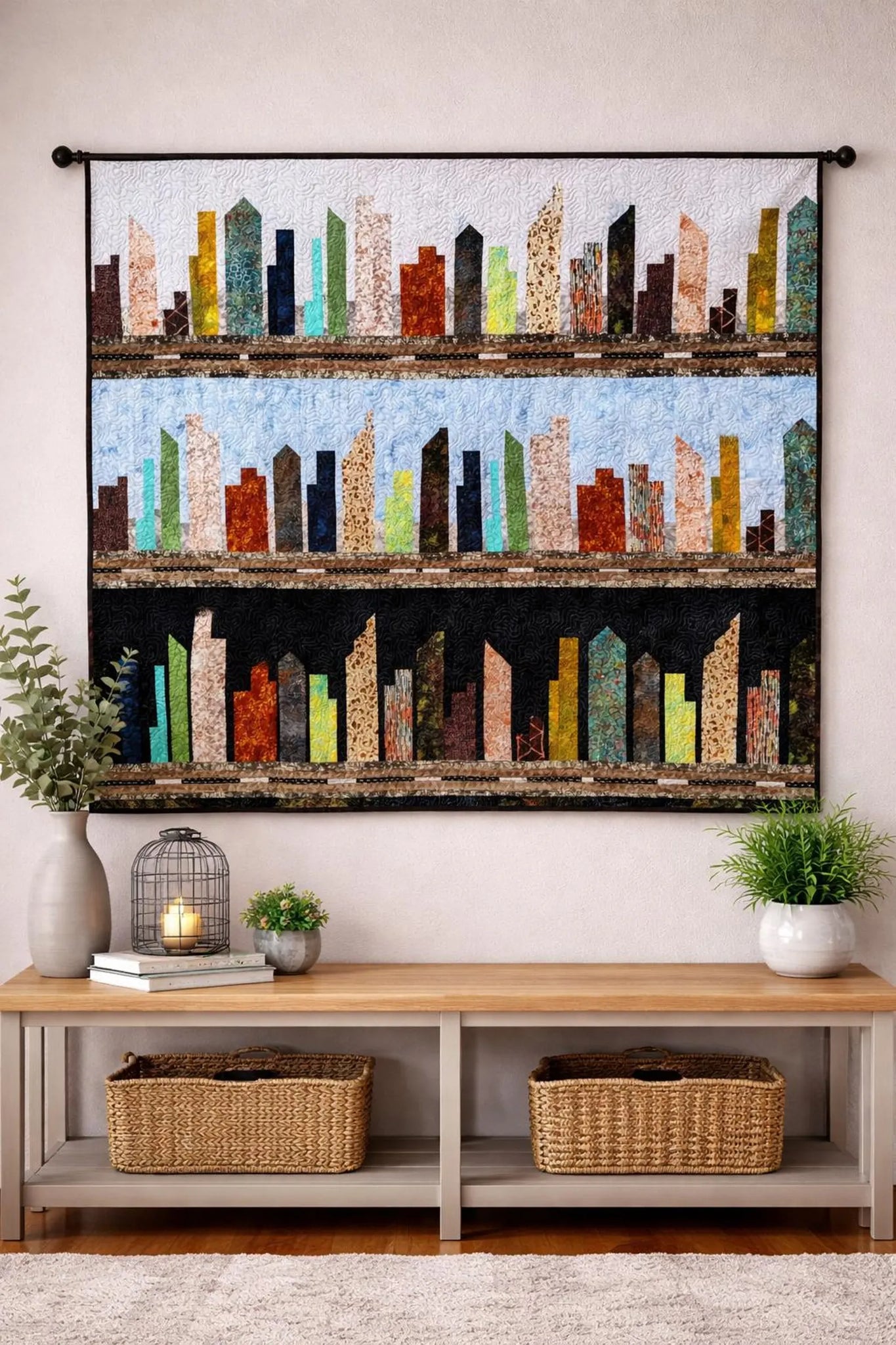 It’s a very beautiful quilt with accurate precise piecing. The quilt is pieced as a city skyline at day and night time.