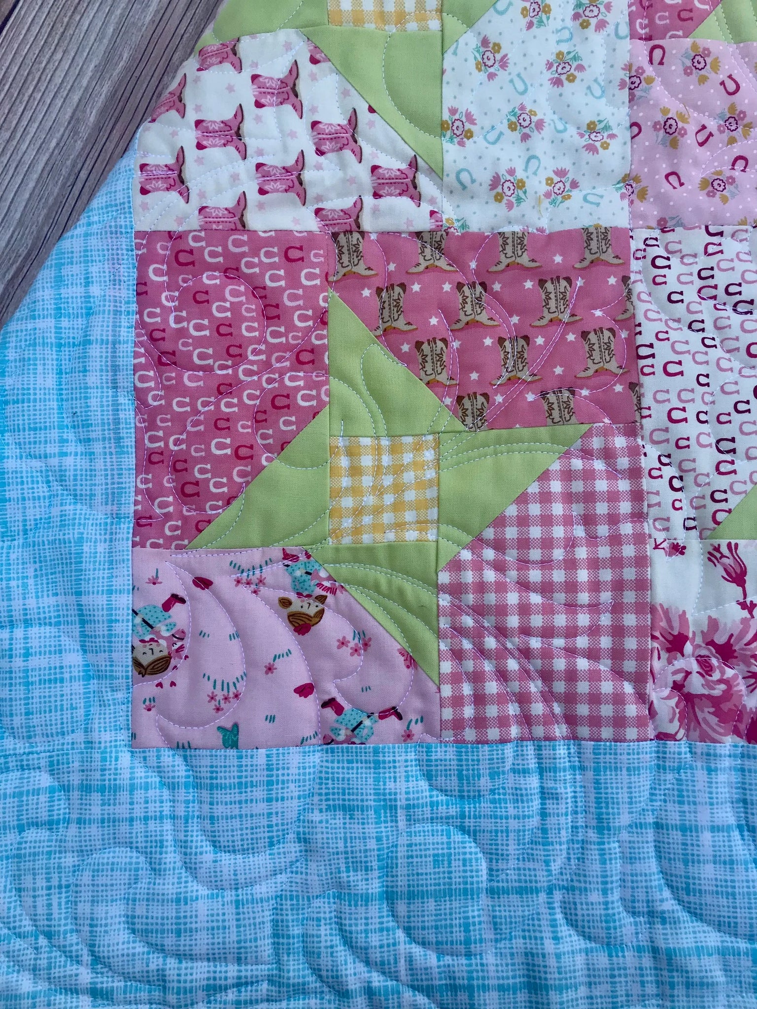 Beautiful quilting fabric line, boys and girls playing, cowboy boots and lucky horseshoes! Al stars are pistachio green, but one is blue and another one is pink. A very delicate touch. Beautiful quilt for a nursery or kids room.