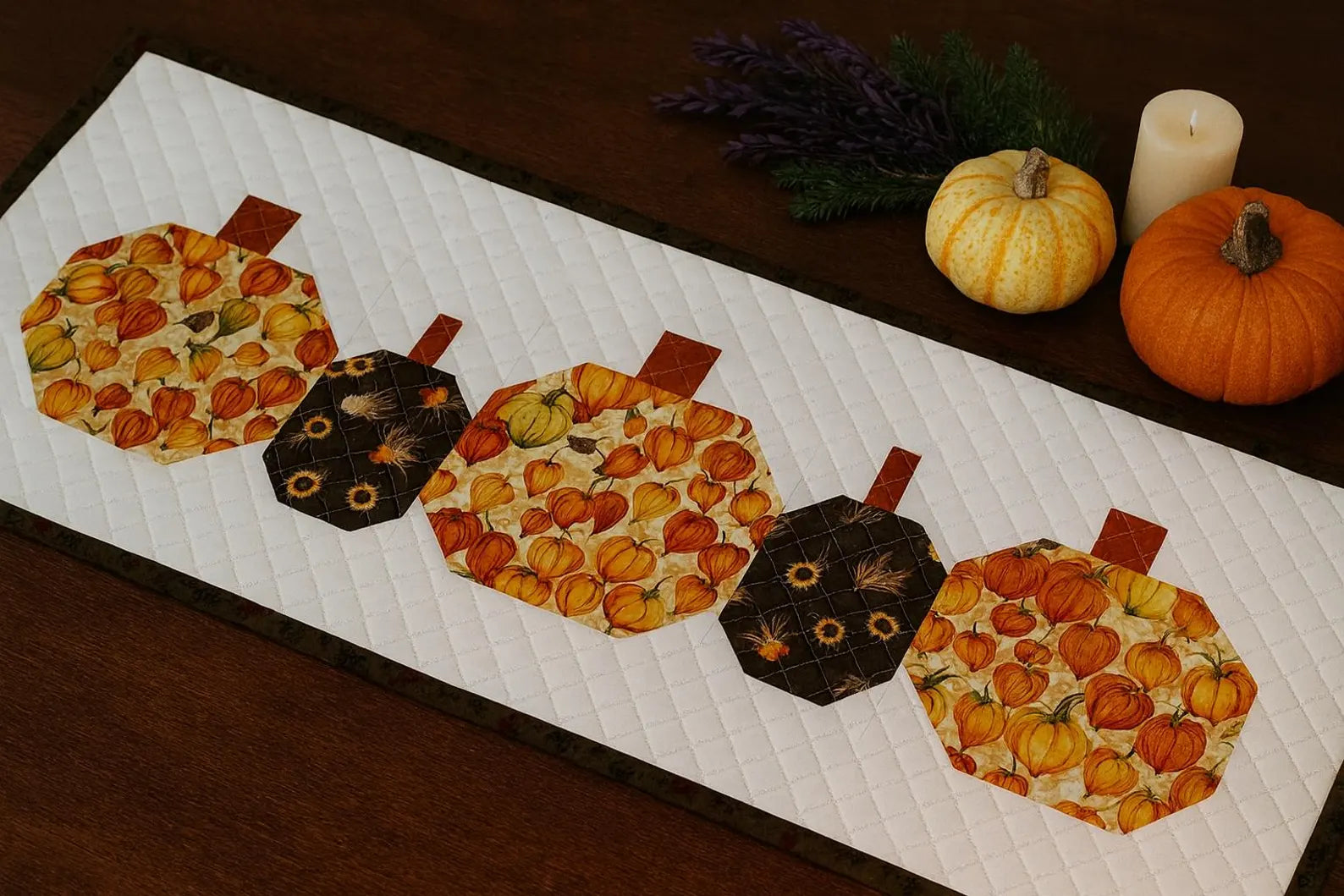 Add a touch of cozy autumn charm to your home with this handmade quilted table runner, beautifully pieced from high-quality cotton fabrics. Featuring a row of festive pumpkins in warm seasonal prints, it’s the perfect accent for your dining table, buffet, or entryway display.