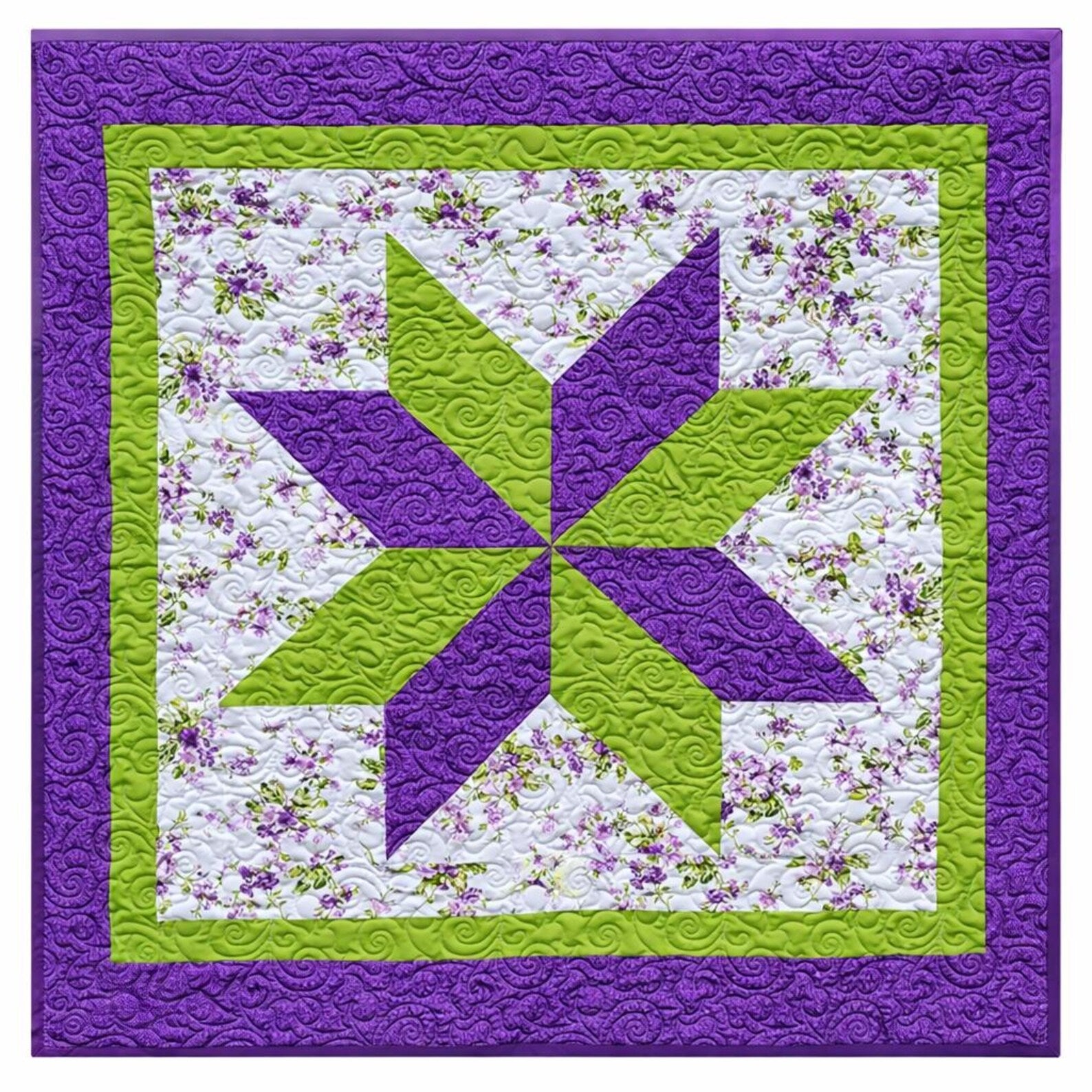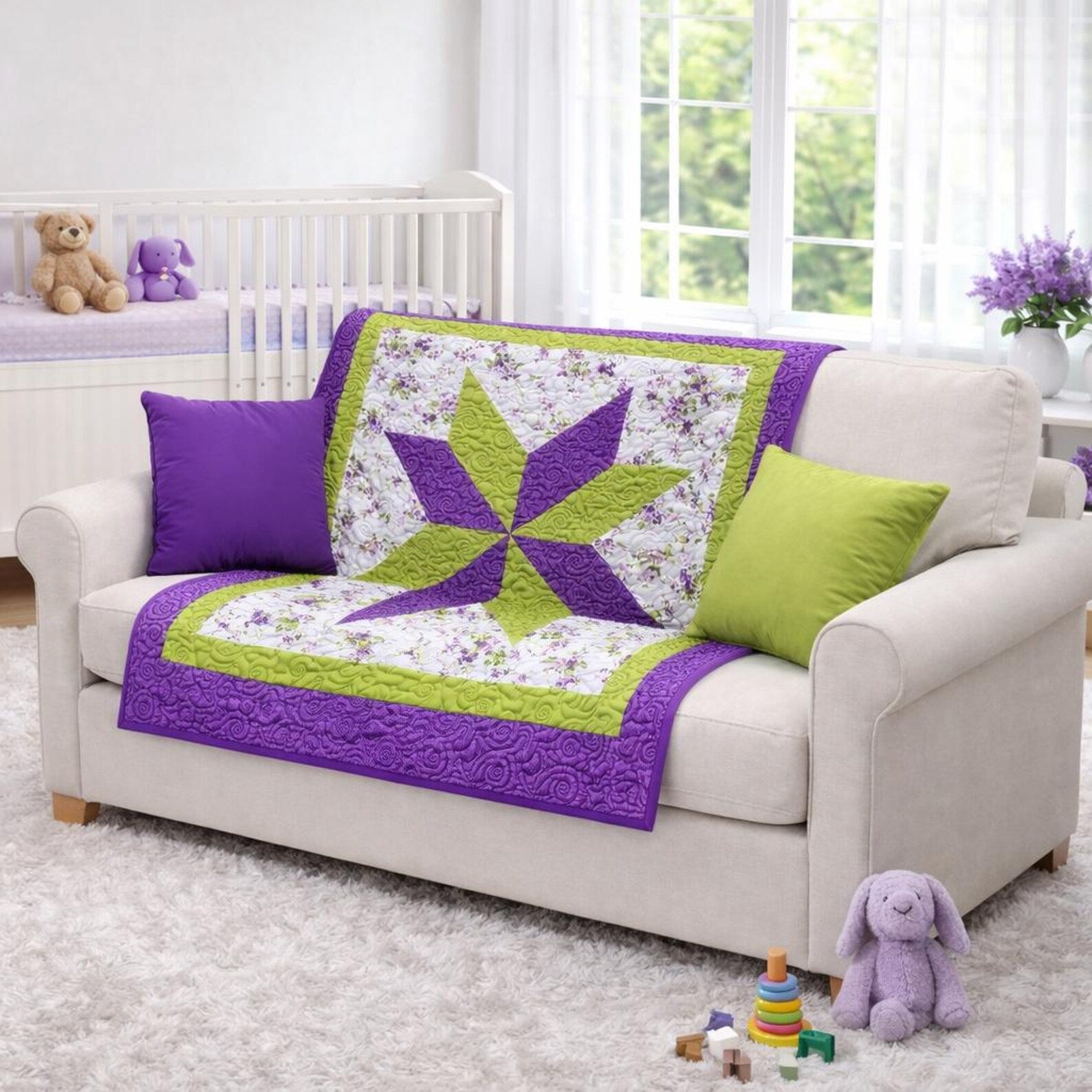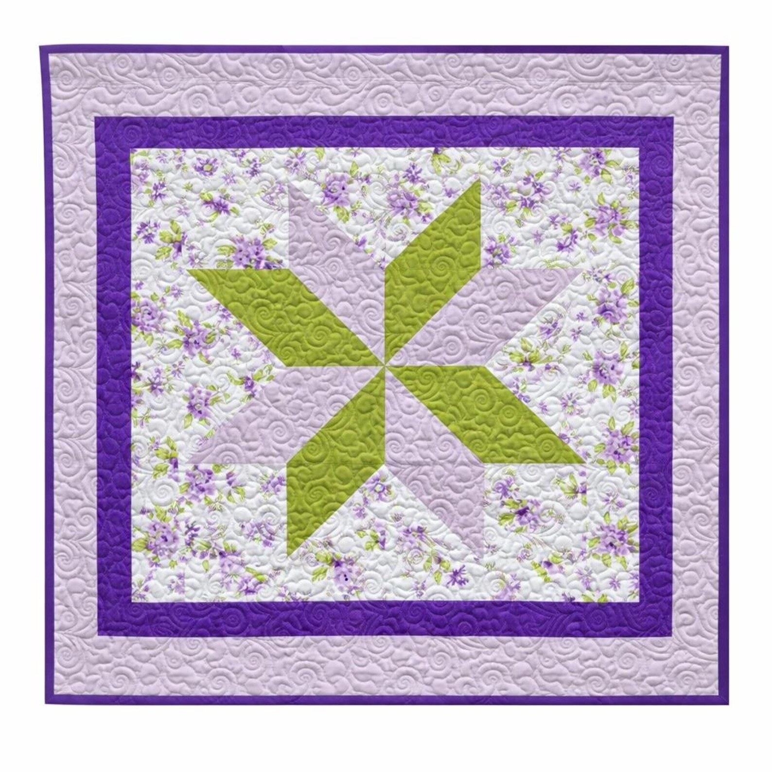 Bring a fresh touch of spring into your space with this beautifully handcrafted quilt, featuring a striking star design in vibrant purple and green. The crisp floral background and bold geometric center create a cheerful, timeless look that works perfectly in a nursery, child’s room, or as a cozy decorative throw.