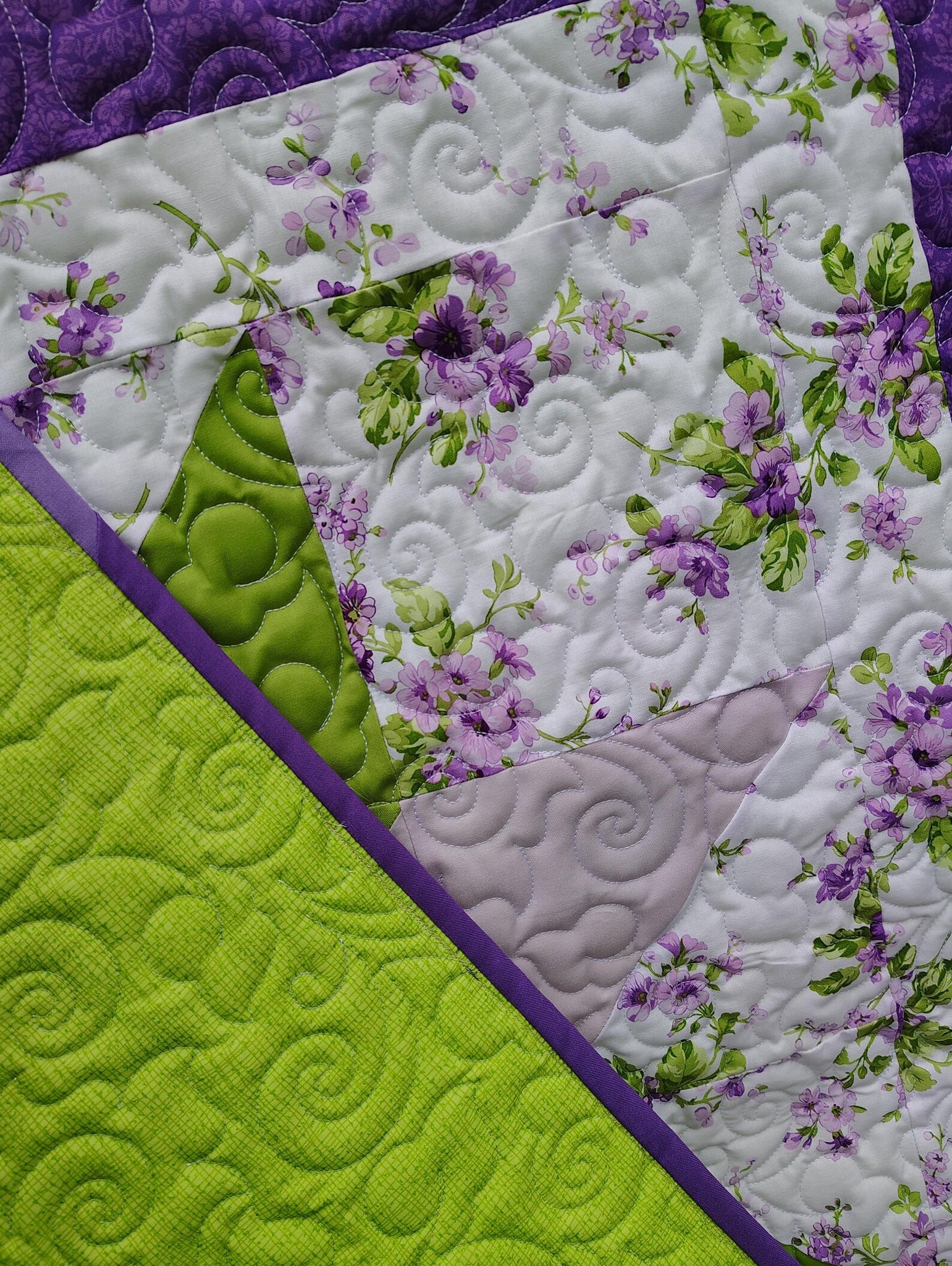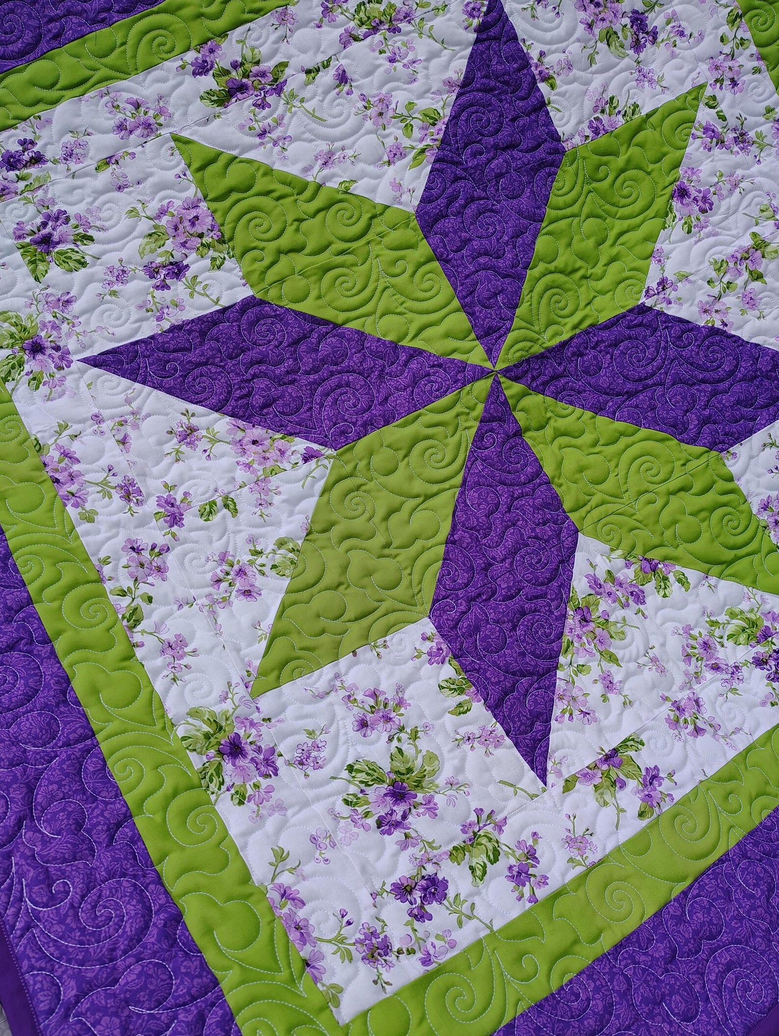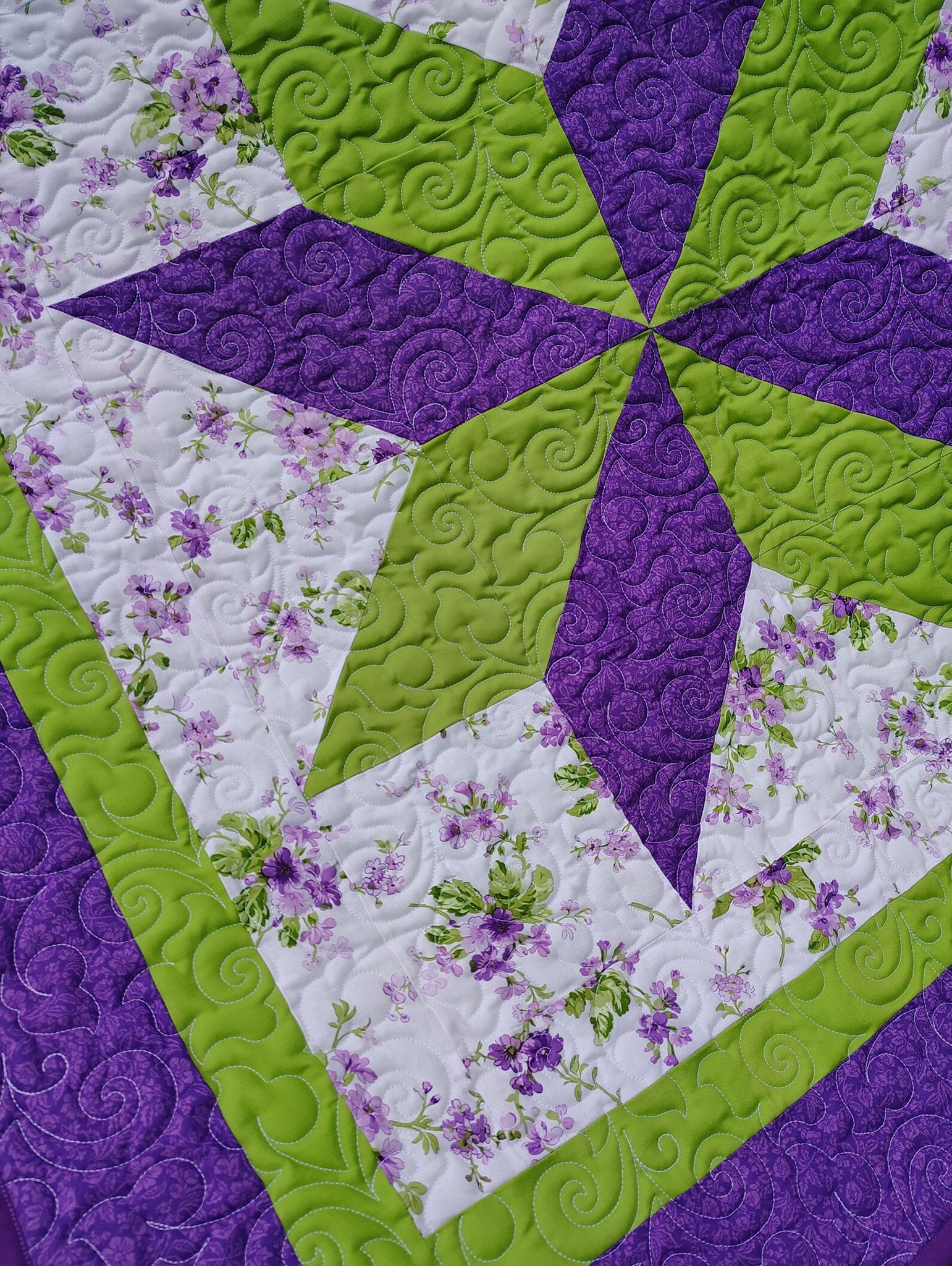Bring a fresh touch of spring into your space with this beautifully handcrafted quilt, featuring a striking star design in vibrant purple and green. The crisp floral background and bold geometric center create a cheerful, timeless look that works perfectly in a nursery, child’s room, or as a cozy decorative throw.